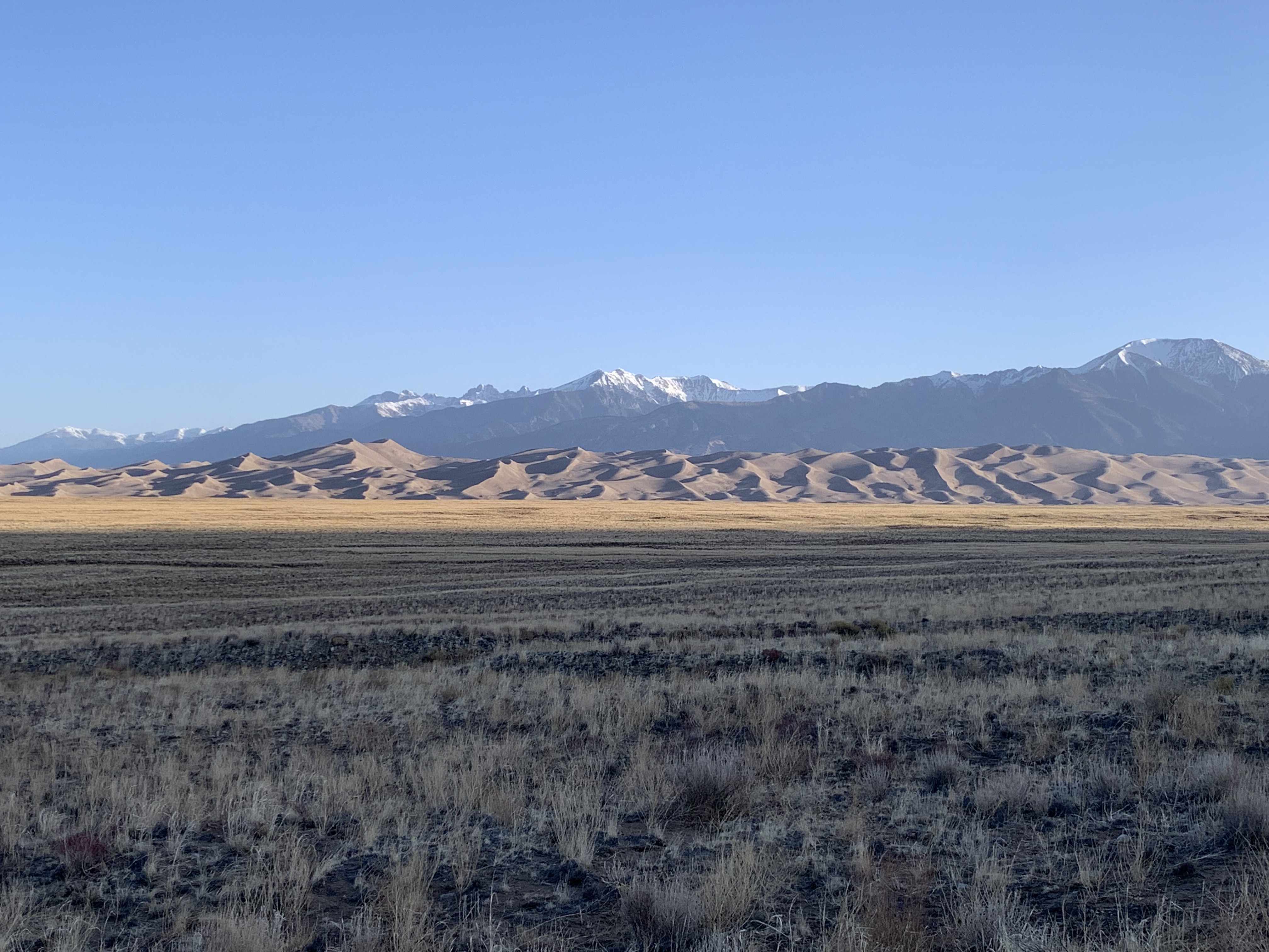 I’m obviously not much of a photographer, but I like this one. The tallest dunes here are over 700 feet, but they’re dwarfed by the surrounding mountains. Since I camped at Piñon Flats in the park, I was able to take this just as the sun came over the mountains, which added shadows for contrast. I hiked into the dunes before dawn and along the creek, but it’s not easy to take an interesting picture of so much brown sand, even in such a beautiful, surreal landscape in the moonlight. The dunes and the neighboring preserve are basically all wilderness, easily hiked into, and our footprints quickly disappear.