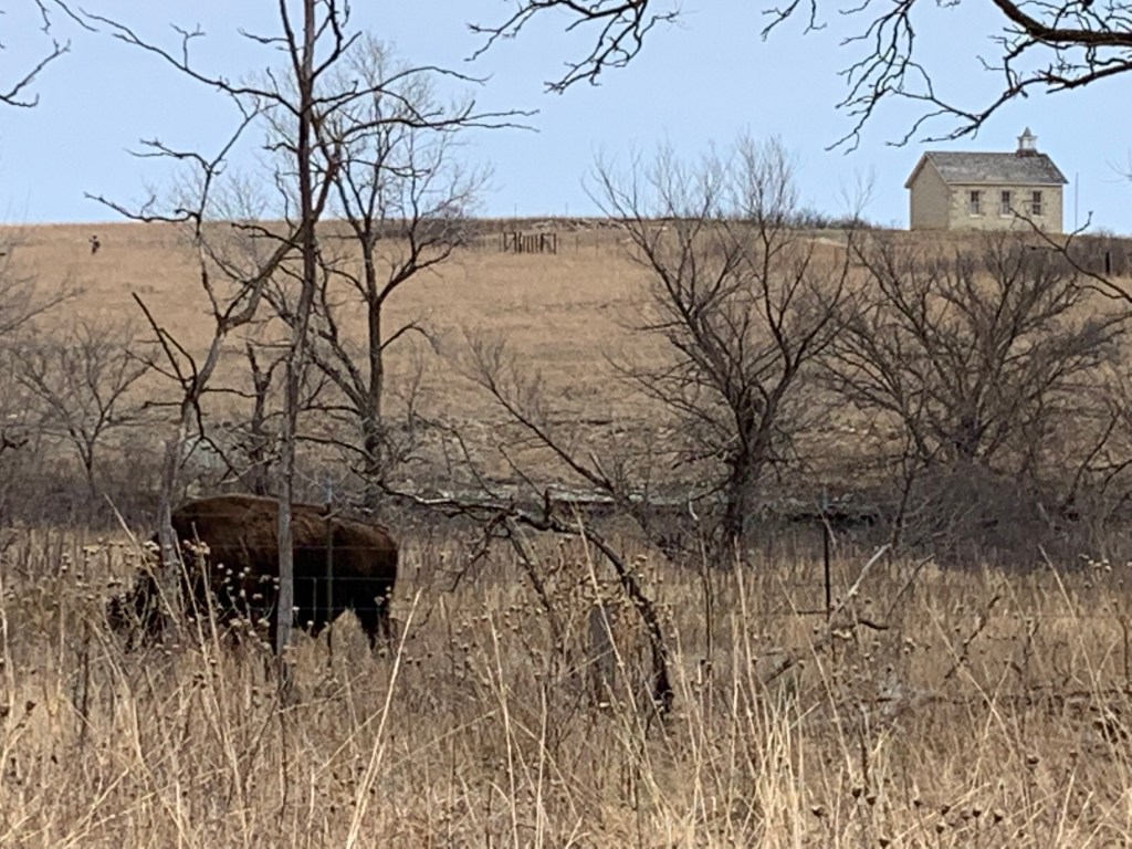 The bison surprised me as I walked along the creek. Fortunately, there’s a barbed wire fence between us, as they can be dangerous. Unfortunately, the ranger later told me that the bison can easily go over or through the fence. The building on the hill is a one-room schoolhouse.