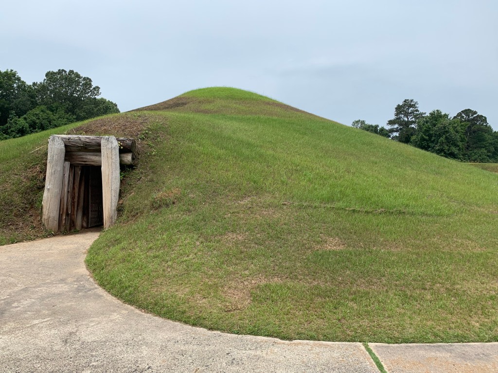The large mounds here date back over 1,000 years, and include the reconstructed earth mound above, temples and funeral mounds of the ancestors of the Creek people. Despite tremendous challenges, the culture continues today, as seen in the Creek Nation Supreme Court Building in Ocmulgee Oklahoma, which is patterned after this mound. The ground inside dates to 1015, and appears similar to kiva I’ve seen in the west. During the Depression the Civilian Conservation Corps reconstructed the roof and built an Art Deco style visitor center. The entrance tunnel is low, carpeted and well ventilated, and it opens into a glassed-in viewing area. Despite not being half as old as Poverty Point, the mounds here also have bird symbols and other similarities. The Creek Nation farmed corn, squash, beans, pumpkin and tobacco here, fished and traded deer skins with the Spanish, French, British and Americans. They largely westernized and had multiple treaty rights to their lands, but they were nevertheless forced to abandon their homeland by Andrew Jackson.