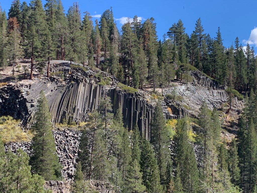Since both the John Muir and Pacific Crest Trails run together through the park, I recommend you hike in a loop around the base of the broken basalt columns, across one of the two bridges across the Middle Fork of the San Joaquin River, along the combined JMT & PCT trail ridge where I got the photo, and back across the other bridge. There are also pretty waterfalls at both the north and especially south ends of the monument, but be careful hiking as the park is at around 7,500 feet in altitude up near the Mammoth Mountain ski area. There’s also a trail up through the trees to the top of the columns, which were formed 80,000 years ago when a diabolically molten lake cooled and cracked deeply in hexagonal and similar shapes and which were revealed by glaciation 15,000 years ago. Enjoy!