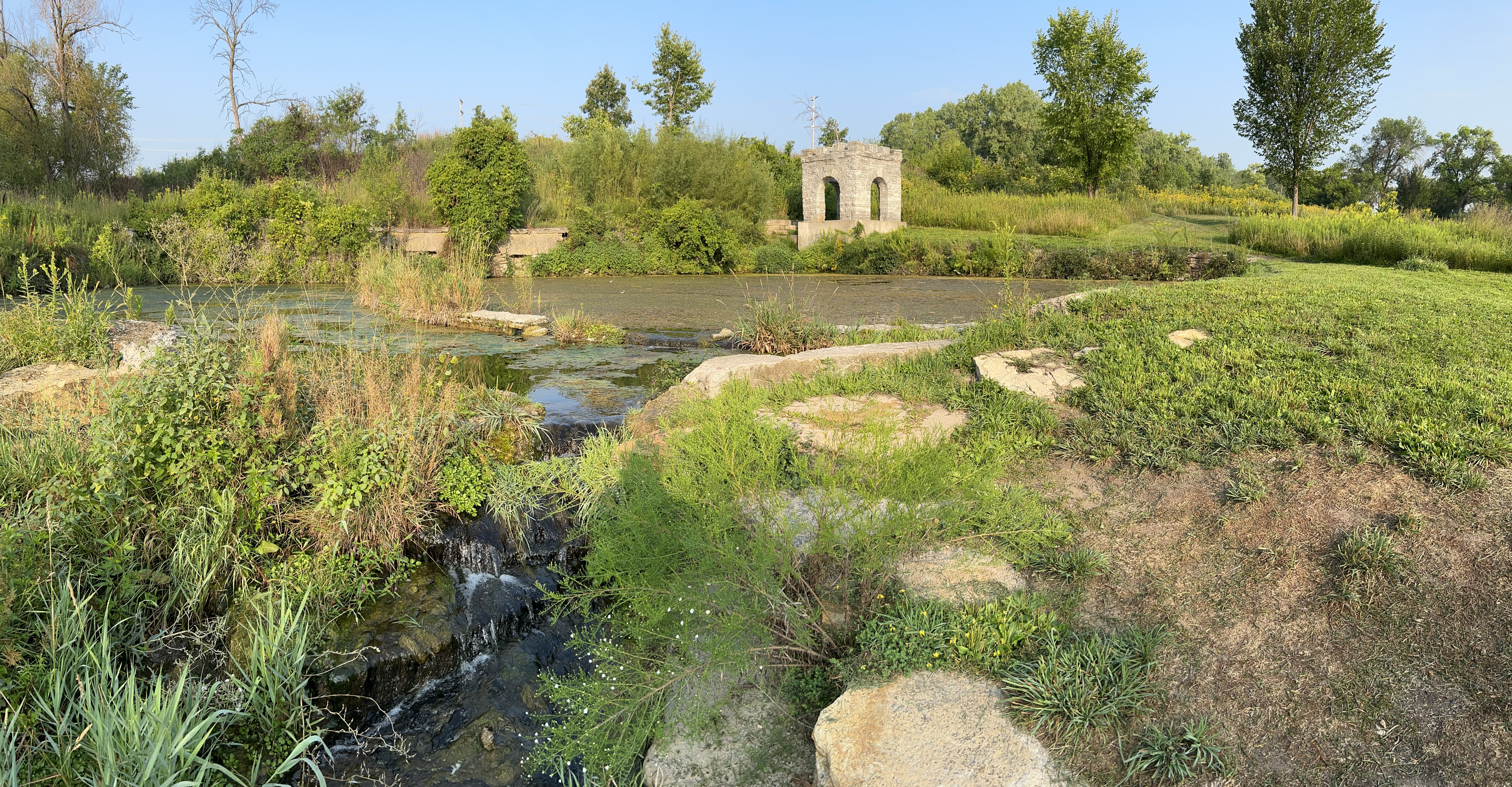 The tiny tributary (above) of the Mississippi River is Coldwater Spring, one of the few parcels of land the park service owns here except for islands. Buildings were removed, plants planted, and the birds and butterflies have already returned. A mink was sighted a few days ago. Having a good spring near the confluence of the Minnesota River made it ideal for an early trading post. Eventually the twin cities of Minneapolis and Saint Paul arose, but, even though you can hear traffic, the spot is mostly wildflowers, prairie grasses, and old Live Oaks.