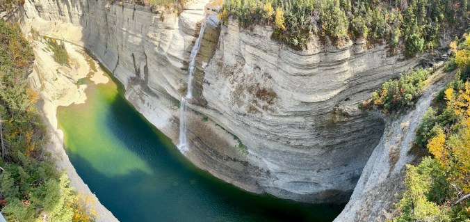 Though cabins are often booked months in advance, it occurred to me that they must take walk-on passengers between the closest two ports. Without a Canadian address, I couldn’t book my ticket online, and the hold times were depressing. So I just drove up the coast and arrived barely 10 minutes before they left. (The boat had gained almost an hour on its schedule overnight.) I parked on the wharf, walked on, paid my fare at the desk, and they welcomed me aboard! Some folks thought I was crazy and others thought I was a worker commuting cheaply to the mainland, but I had a pleasant time relaxing in the lounge and eating in both the cafeteria and the dining room. Optimistically, I had booked a B&B with an island day tour, and the everything worked out well. While the waterfall is less impressive in the autumn, it’s still taller than Niagara Falls, and the weather and foliage were lovely. On the way back, I even got a bunk for the overnight trip.