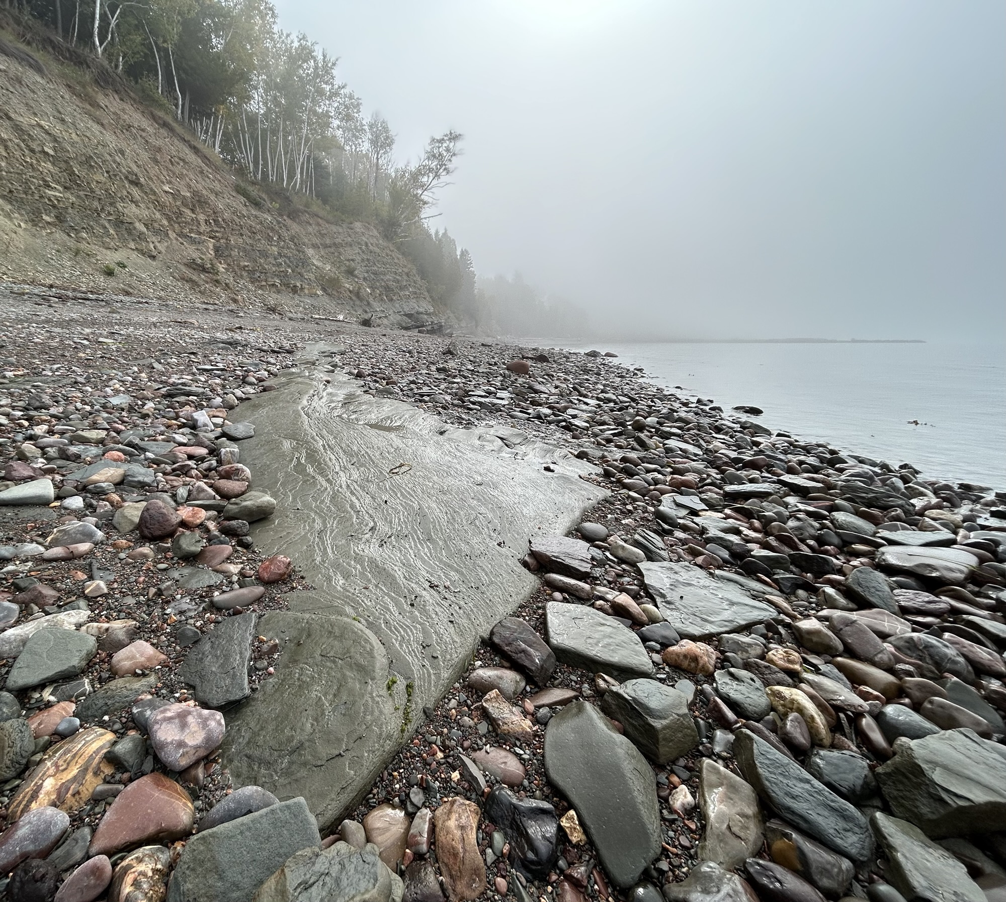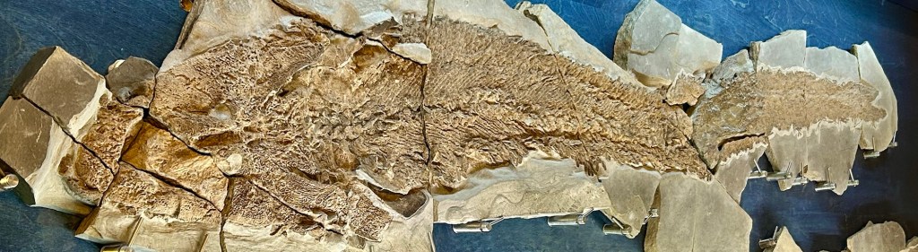 Miguasha is on the south side of the Gaspé, with high sedimentary cliffs, lots of pretty rocks, and many fossils, often well preserved in large flat layered rocks, like in the photo. Around 15 years ago, a visitor apparently found a rock at the water’s edge that had split, revealing a large fish tail. They did the right thing and left it for the local fossil experts to examine. Shortly thereafter, the experts found more pieces, fit them together with the earlier find, and put together a 5’ 3” fish fossil puzzle. While the site had been producing Devonian fossil finds for decades, this one was the King.