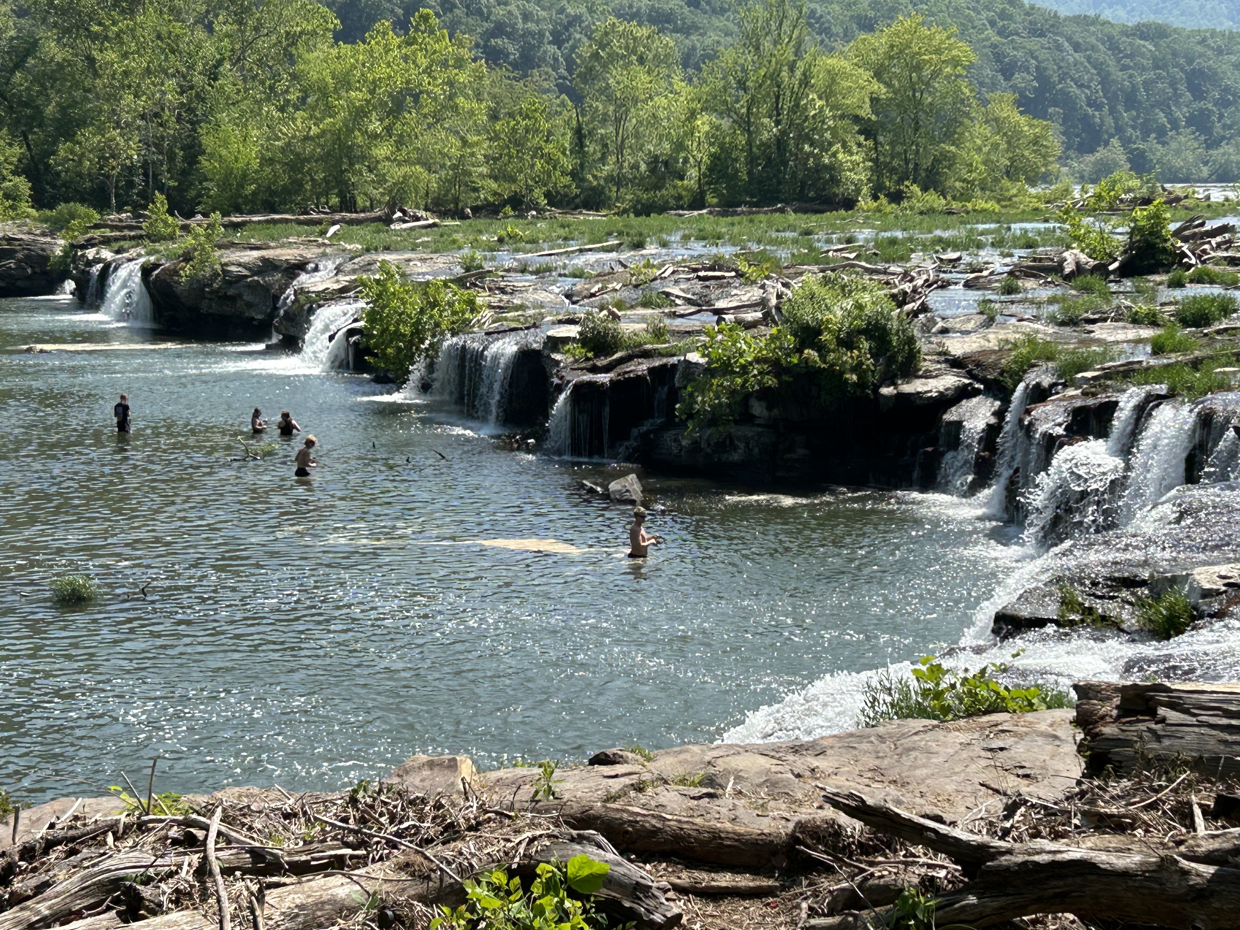 But the bridge is not the point of the park. The New River watershed is huge and very old. It starts in North Carolina near the Blue Ridge Parkway, includes the Bluestone and Gauley scenic rivers, and flows up to the Kanawha which is a major tributary into the Ohio River. The photo above shows folks fishing at Sandstone Falls, far upstream of the famous bridge. It’s a lovely spot with plenty of birds, an easy hike and a boardwalk.