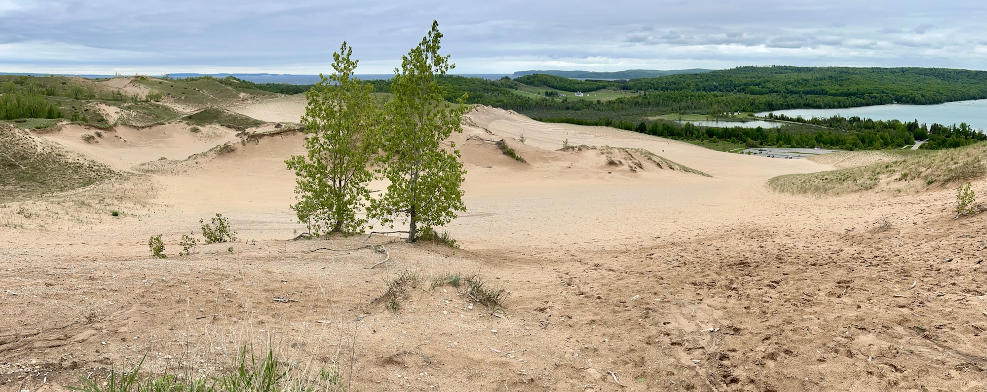 The small lake on the right is Glen Lake, and Lake Michigan is at the top left. If you zoom in to the right, you might see tiny people climbing the middle dune from the parking lot. I got up to this vast view on the pleasant Cottonwood Trail (less than 2 miles round trip) from the Pierce Stocking Scenic Drive, which also takes you to the breathtaking Lake Michigan Overlook and the splendid Sleeping Bear Overlook. Many folks seem to want to do things the hard way, but I definitely recommend hiking from the scenic drive. The impressive Sleeping Bear Dune itself is over 1000 feet high, and folks frequently need rescuing ($3,000) after climbing down to the lake and not being able to climb back up. A few extreme winter folk ski down the steep dune to the lake. Not sure how they get back up. Please stay on the trails, as past humans caused much erosion damage to the fragile ecosystem here. This is a beautiful park with wildlife, deep Native American roots, and it is part of a new UNESCO Biosphere across northern lower Michigan.