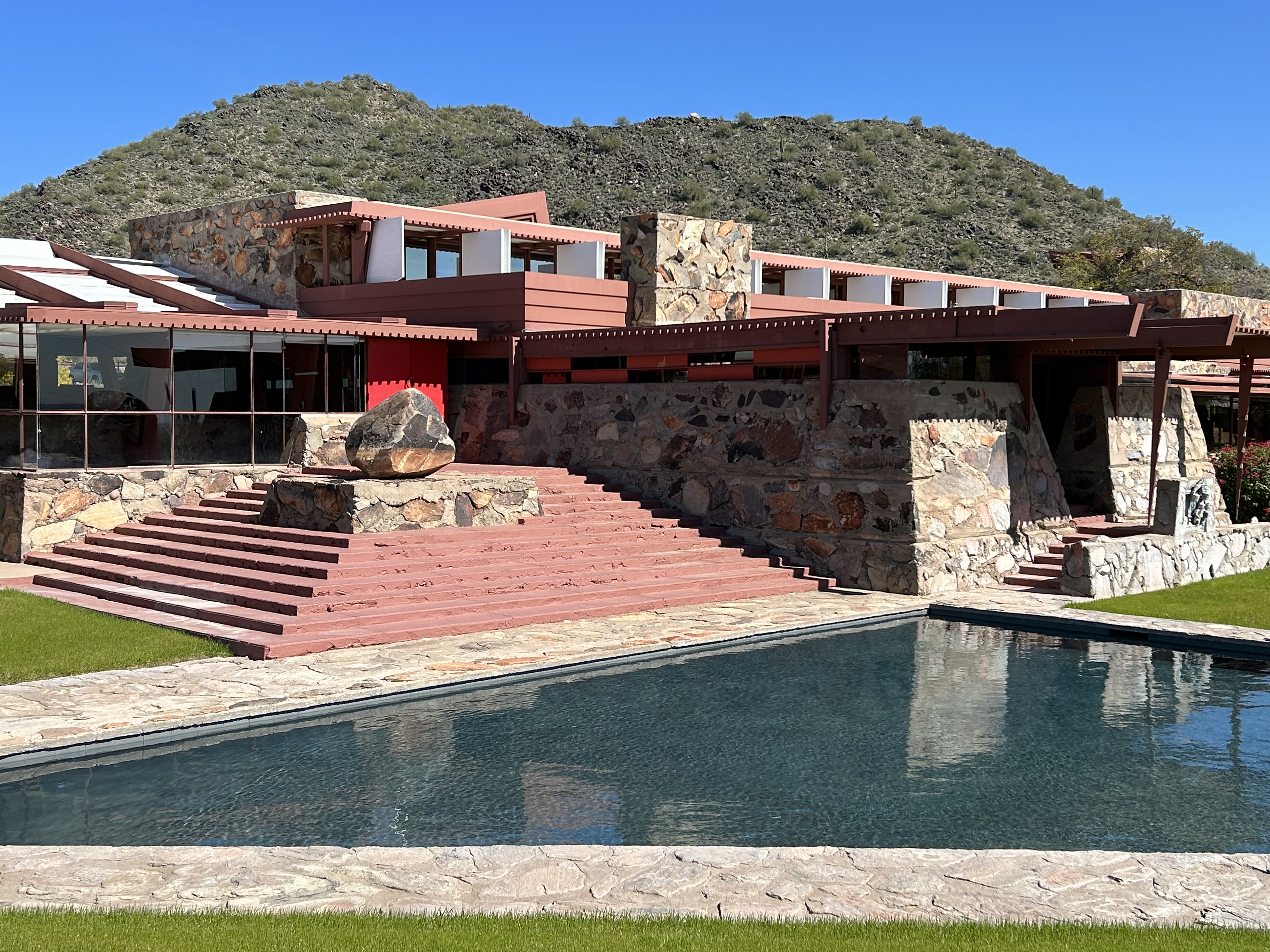 Frank Lloyd Wright’s winter home until his death in 1959, this World Heritage site is a remarkable example of his architecture. The architect preferred to build just below the top of a hill, on the ‘brow’ or taliesin in Welsh. The triangular pool brings the background mountains into the foreground, and the front walk forms a point like the bow of a ship to admire distant mountains, like islands across the undulating desert landscape where cholla cactus looks like coral. Besides the bright red door behind the rock and the small ornately carved scene to the right, there are Chinese influences throughout, including many more carvings, an elaborate story panel, a round garden door, a bell, a dragon and other architectural touches. Inside you can sit in his origami chairs and study the internal structure of a nautilus or the draft blueprint of the Guggenheim. Wright brought his students and apprentices to live and work, and he established an institute dedicated to his school of architecture. Situated in the tony Scottsdale neighborhood, the audio tour of the property is detailed, takes you around step by step and explains his architectural philosophy. Guided tours are also available, and schedules & numbers are strictly limited to keep a steady flow through the small parking lot and on the tours.
