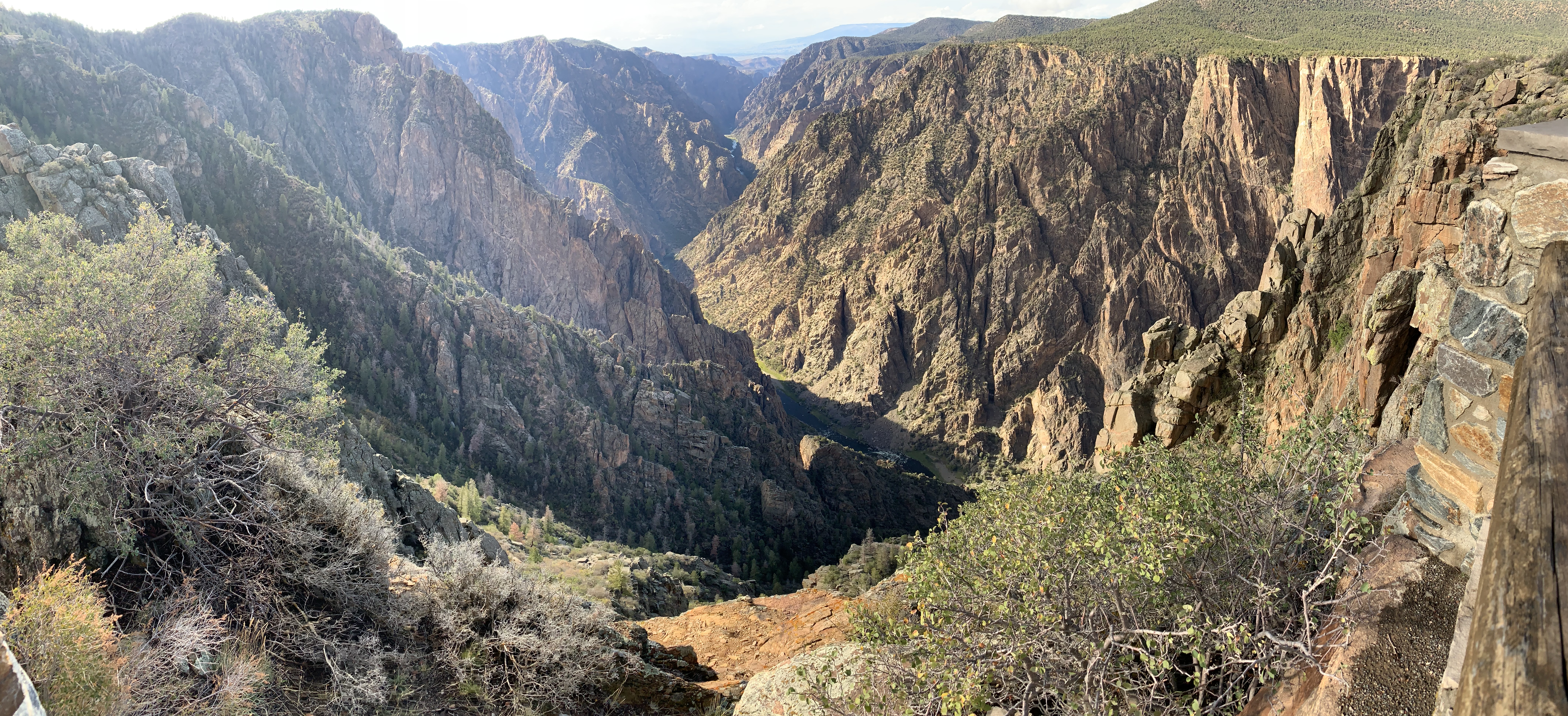 The South Rim has a campground and a visitor center, and is only steps from Gunnison Point, which may have the best view down into the canyon, although my photography skills were insufficient. The short hiking trails along the rim, down into the canyon (a little) and to the high point to the left above each provide a different view into the geologic depths.
