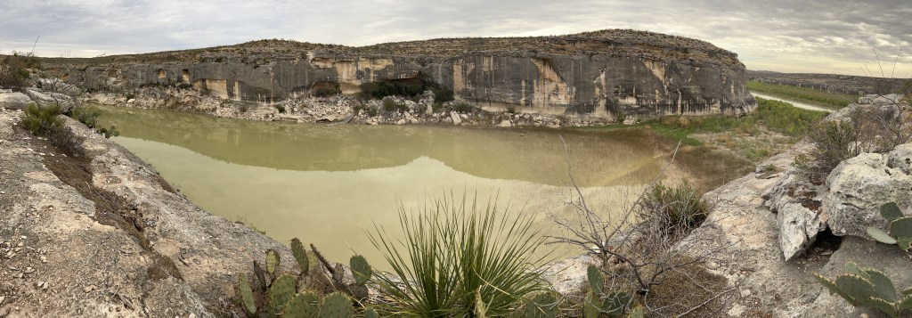 In 1969, just below the confluence of the Rio Grande, Devils and Pecos Rivers, a dam was built, creating Lake Amistad (friendship en Español). The lake caused the mouths of the Pecos River and Seminole Creek (above) to silt up, and now that the water level has fallen (like Lake Mead and Lake Powell) they’re cut off from the Rio Grande (see far right). Most of the boat ramps, like the small dock at the cave above, are no longer accessible. The lake is far below minimum expectations, because the US diverts virtually all the Rio Grande water before it even reaches Big Bend. From there most of the river comes from Mexico’s Río Conchos. The park is run in partnership with many agencies, and the two towns that share the border are friendly and have joint cultural festivals annually. Mexico maintains a small fishery, US residents enjoy bass fishing, and the border is marked with buoys. I took one of the old highway ‘spurs’ straight down to the water, but it was too hot to kayak in winter.